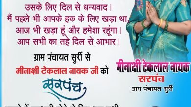 जनपद पंचायत पुसौर के ग्राम पंचायत सुर्री में मीनाक्षी टेकलाल नायक चुने गये सरपंच।