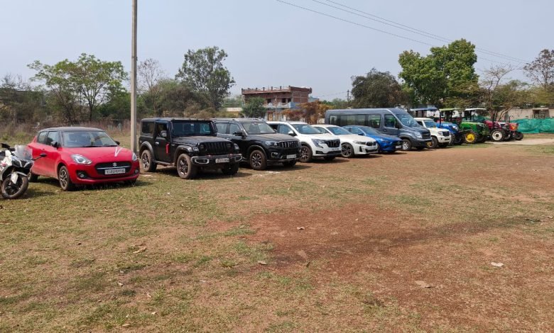 छापे मार कार्यवाही में जप्त की गई कई लग्जरी कार,बाइक ,ट्रैक्टर एवं पिकप।