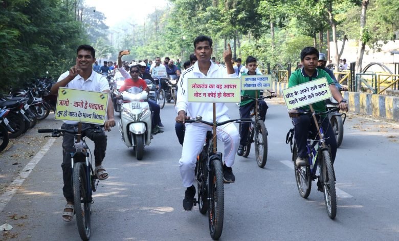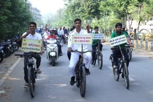 रायगढ़, 29 अप्रैल 2024/ लोकसभा निर्वाचन-2024 के अवसर पर स्वीप कार्यक्रम के अंतर्गत मतदाता जागरूकता अभियान के तहत स्वीप साइकिल रैली का आयोजन किया गया। साइकिल रैली के माध्यम से मतदाताओं को जागरूक करने का प्रयास किया गया। साथ ही यह आव्हान किया गया कि 7 मई को होने वाले मतदान में वे शत-प्रतिशत भागीदारी सुनिश्चित करें। कलेक्टर एवं जिला निर्वाचन अधिकारी श्री कार्तिकेया गोयल के निर्देशन में साइकिल रैली का नेतृत्व सीईओ जिला पंचायत एवं स्वीप नोडल अधिकारी श्री जितेन्द्र यादव कर रहे थे। इस दौरान आयुक्त नगर निगम श्री सुनील कुमार चंद्रवंशी भी साथ उपस्थित रहे।