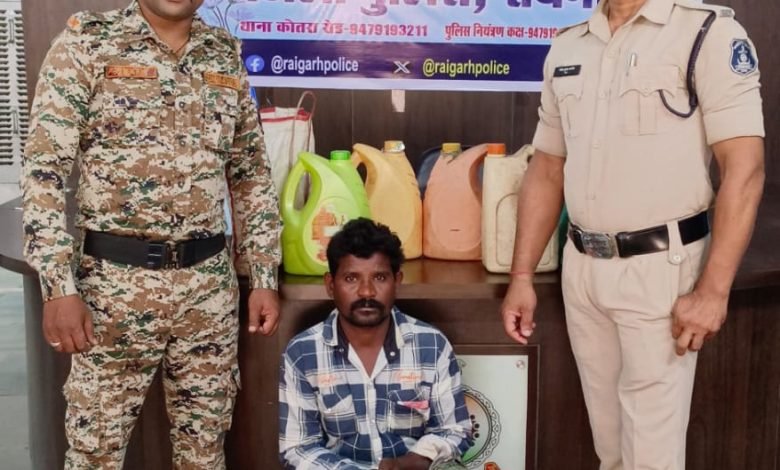 *09 अगस्त, रायगढ़* । रायगढ़ जिले के कोतरारोड़ थाना क्षेत्र में पुलिस ने अवैध शराब के खिलाफ कार्रवाई करते हुए संजय कुमार मांझी नामक व्यक्ति को आज सुबह मेन रोड बरमुडा के पास घेराबन्दी कर गिरफ्तार किया है। पुलिस को मुखबिर से सूचना मिली थी कि ग्राम पचेड़ा निवासी संजय कुमार मांझी (उम्र 36 वर्ष) अवैध महुआ शराब बिक्री के लिए लेकर जा रहा है। पुलिस ने तुरंत कार्रवाई करते हुए मेन रोड बरमुडा के पास घेराबंदी कर आरोपी को धर दबोचा। आरोपी के कब्जे से 18 लीटर कच्ची महुआ शराब बरामद की गई, जिसकी कीमत लगभग 1800 रुपये है। पुलिस ने आबकारी एक्ट के तहत मामला में आरोपी को गिरफ्तार कर रिमांड पर भेजा गया है। इस कार्रवाई में थाना प्रभारी त्रिनाथ त्रिपाठी के साथ प्रधान आरक्षक शंकर राम कालो, आरक्षक चंद्रेश पांडेय, प्रवीण राज और राकेश नायक शामिल थे।