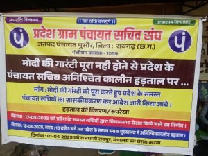 रायगढ़ :- छत्तीसगढ़ के सभी ब्लाकों में प्रदेश ग्राम पंचायत सचिव संघ के आहवान पर पंचायत सचिव शासकीय सेवा में नियमिति करण को लेकर हड़ताल में बैठे हुए है। ग्राम पंचायत सचिव सुदामा भोय ने बताया कि वर्तमान सरकार ने घोषणा पत्र मोदी के गारंटी में पंचायत सचिव की शासकीय सेवा में नियमितिकरण को लेकर भरोसा दिया है। लेकिन 1वर्ष बाद भी आज पर्यन्त तक मोदी के गारंटी में पंचायत सचिव का शासकीय सेवा में नियमिती करण को लेकर कुछ भी नहीं हुआ है। यहां तक कि बजट सत्र में भी नहीं आने एवं इस विषय पर सरकार द्वारा कोई भी पहल नहीं करने के कारण पूरे प्रदेश के पंचायत सचिव क्षुब्ध एवं आक्रोशित है। सुदामा ने कहा कि इसीलिए प्रदेश पंचायत सचिव संघ के द्वारा दिनांक 10/ 03/2025 को धर्म नगरी कवर्धा बैठक में निर्णय लेते हुए दिनांक 17/03/2025 को प्रदेश के समस्त सचिवों द्वारा विधानसभा घेराव एवं 18/03/25 से ब्लॉक मुख्यालय में अनिश्चितकालीन हड़ताल तथा 1/04/25 को मंत्रालय घेराव करने का निर्णय प्रदेश पंचायत सचिव संघ द्वारा ली गई है। सचिव संघ पदाधिकारी संत राम पटेल ने कहा कि हमारी एक सूत्रीय मांग नियमितीकरण नहीं होगा तब तक हड़ताल जारी रहेगी। अब देखने वाली बात यह है कि ग्राम पंचायत सचिवों के हड़ताल में जाने से पंचायत की मूलभूत व्यवस्था बिगड़ते जा रही है वहीं गर्मी के शुरुआत के कारण पीने का पानी के लिए किल्लत का सामना आमजनताओ को करना पड़ रही है। क्योंकि पंचायत में सचिव नहीं होने से पंचायत कार्य पूरी तरह से ठप्प पड़ गया है। अब छत्तीसगढ़ सरकार इन सचिवों के मांग को कब तक पूरी करती है और आम जनताओं के पंचायत स्तर के समस्याओं को कैसे निदान करता है।