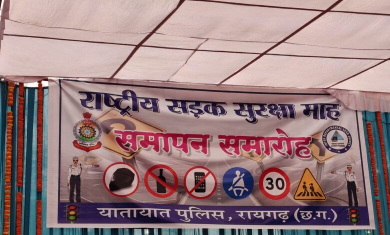 *रायगढ़, 31 जनवरी*। सड़क दुर्घटनाओं में कमी लाने तथा आम नागरिकों को यातायात नियमों के प्रति जागरूक करने के उद्देश्य से जिले में 01.01.2026 से 31.01.2026 तक मनाए गए राष्ट्रीय सड़क सुरक्षा माह का आज पुलिस सामुदायिक भवन परिसर में समापन किया गया। समापन कार्यक्रम में रायगढ़ पुलिस द्वारा आयोजित विभिन्न जागरूकता गतिविधियों में बढ़-चढ़कर हिस्सा लेने वाले स्कूली बच्चों को अतिथियों द्वारा पुरस्कार एवं प्रशस्ति पत्र देकर सम्मानित किया गया। साथ ही कार्यक्रम को सफल बनाने में सहभागी रहे शासकीय एवं गैर शासकीय संस्थाओं का जिला पुलिस द्वारा आभार व्यक्त किया गया।