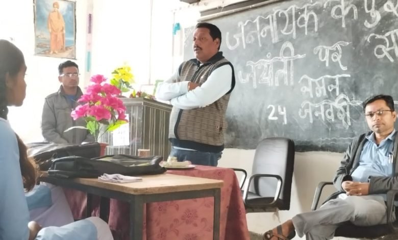 *शासकीय उच्चतर माध्यमिक विद्यालय बड़े रबेली विकासखंड मालखरौदा, जिला सक्ती में हर्षोल्लास के साथ जननायक कर्पूरी ठाकुर की 100वीं जयंती मनाया गया, कार्यक्रम का प्रारंभ जननायक कर्पूरी ठाकुर के चित्र पर माल्यार्पण,अगरबत्ती तथा धूप दीप से किया गया, जननायक कर्पूरी ठाकुर के विषय में मुख्य वक्ता के रूप में रूप में श्री राधेश्याम शतरंज जी ने कहा कि आदरणीय कर्पूरी साहब गांव के गरीब, दलित, वंचित, शोषित अति पिछड़े वर्ग, छोटे किसान के दुख दर्द को समझते थे तथा उनके लिए सामाजिक न्याय, आर्थिक न्याय, समानता के लिए सर्वस्व ने समर्पण कर दिया, श्रीमती उत्तर साहू मैडम कहां की श्री ठाकुर सामाजिक न्याय के प्रतीक के रूप में हमेशा याद किए जाएंगे, उनके विचार, अभिव्यक्ति, तथा समाज के अंतिम व्यक्ति को भी सम्मान से जीने के विषय में विस्तार से अवगत कराया, विद्यालय के प्राचार्य श्री बालाराम दिनकर जी ने मंच को संबोधित करते हुए कहा कि हमें जननायक कर्पूरी ठाकुर के आदर्शों पर चलकर सर्व मानव कल्याण की विचारधारा को जीवन में अपना सकते हैं, आदरणीय ठाकुर ने अपने जीवन को त्याग करके हम सबको सम्मान के साथ जीने का अवसर प्रदान किए हैं, हम उनके सदैव ऋणी रहेंगे, ऐसे महामानव का जन्म कभी-कभी ही होता है, गरीबों की,शोषितों,की, अपेक्षित की, भावनाओं को समझ करके उसकी दुख -दर्द को कम करने के लिए रात -दिन एक कर देते हैं और अपना सर्वस्व बलिदान कर देते हैं, इस कार्यक्रम में श्री लिबनुस कुजूर, श्री विजय जांगड़े, श्री दिलीप शतरंज शाहिद छात्र-छात्राओं की उपस्थिति रही. कार्यक्रम का संचालन श्री प्रमोद कुमार श्रीवास द्वारा किया गया.*